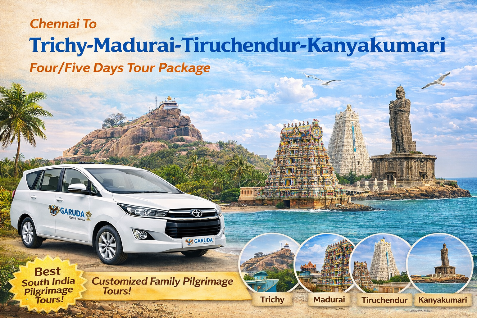 Embark on an unforgettable South India journey with our Chennai to Trichy-Madurai-Tiruchendur-Kanyakumari Four/Five Days Tour Package, designed for travelers and devotees who want to explore historic temples, coastal beauty, and cultural landmarks in comfort. This Chennai to Trichy-Madurai-Tiruchendur-Kanyakumari Four/Five Days Tour Package includes convenient pickup from Chennai, travel in well-maintained AC vehicles, and professional drivers to ensure a safe and hassle-free trip.
